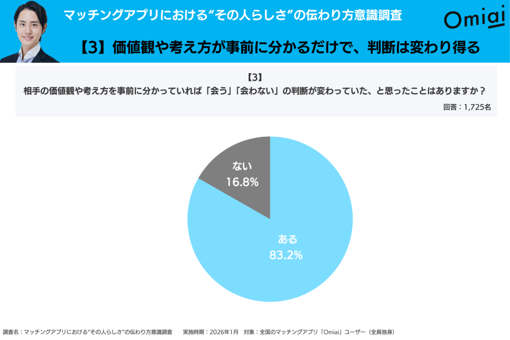 マッチングアプリの出会いでも、会う前に相手を理解する情報が限られ、“その人らしさ”の解像度が上がりにくい場面があり、その結果「会う/会わない」の判断が難しくなったり、関係が進んでから「先に知っていれば」と後悔が生まれやすくなる。今回の調査では、まさにこうした「判断負荷」と「後悔」の実態が可視化されました。