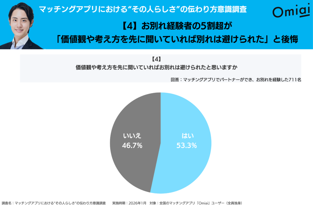 河内:後悔は結果論で終わらせず、次の出会いに活かせる示唆があります。マッチングアプリで出会った恋人・配偶者とのお別れ経験者のうち53.3%が「先にわかっていれば別れは避けられた」と回答しました。会う前〜関係初期の相互理解が、すれ違いの予防に関わり得ることを示していると捉えています。