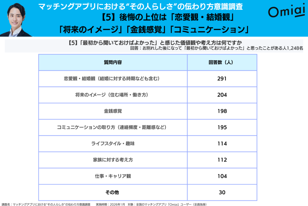 【5】後悔の上位は「恋愛観・結婚観」「将来のイメージ」「金銭感覚」 「コミュニケーション」
