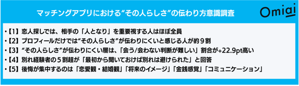 本調査では、プロフィールだけでは“その人らしさ”が伝わりにくい実態と、それが「会う/会わない」の判断の難しさにつながり得る傾向が示唆されました。また、お別れ後の後悔は「恋愛観・結婚観」「将来のイメージ」「金銭感覚」「コミュニケーション」など“らしさ”に直結するテーマに集中していました。判断に伴い心理的負担は少なからずあるものだと思いますが、「Omiai」では、出会いの「メンパ」、いわゆる心理的負担の軽減につながる体験づくりを推進してまいります。