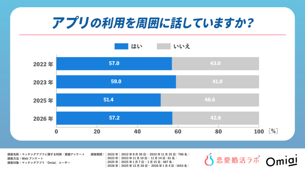 マッチングアプリを利用していることを周囲に話しているかについては、「はい」が2022年57.0%、2023年59.0%、2025年51.4%、2026年57.2%となりました。