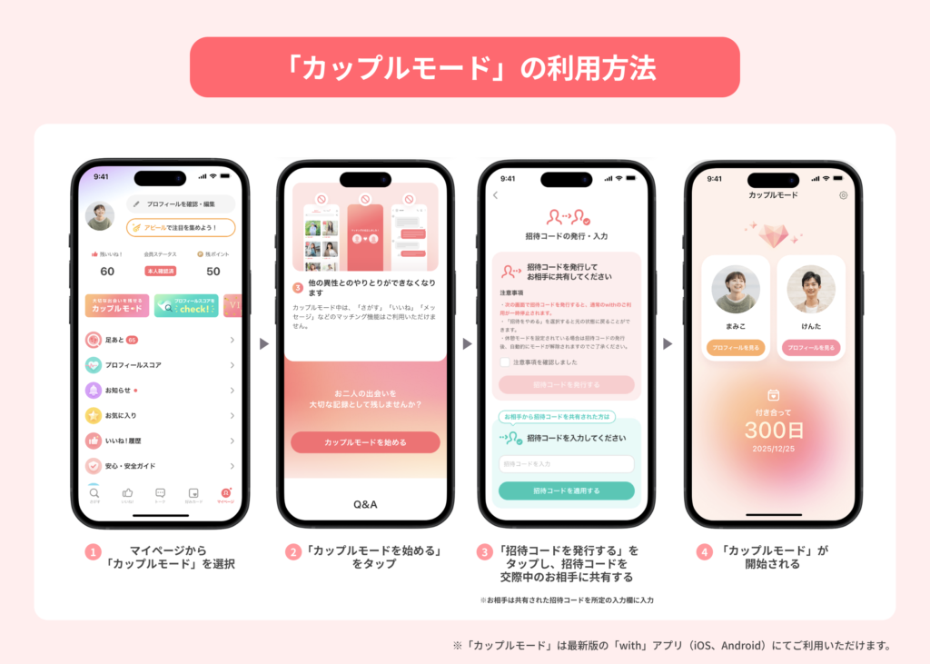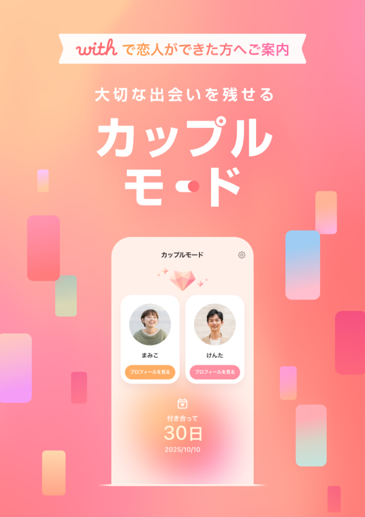 この度「with」は、出会いの瞬間だけでなく、出会った後に育まれていく時間も大切にしていただきたいとの想いから、新機能「カップルモード」を開発しました。