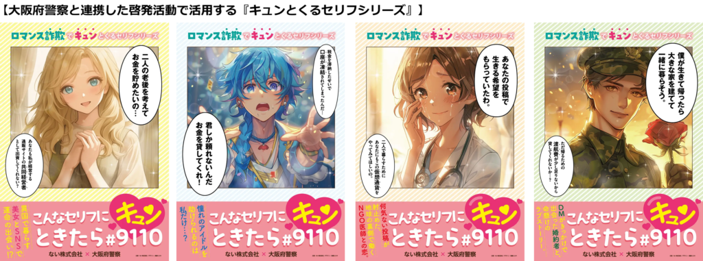 ※1:『キュンとくるセリフシリーズ』は、大阪府警察の依頼のもと、ない株式会社が企画・制作しています。同シリーズのポスターは、大阪府警察が大阪府遊技業協同組合の協力を得て、大阪府下の警察署や交番の掲示板、駅、商業施設などに掲示しています。また、動画については、サイネージでの放映や大阪府警察公式SNS(YouTube、X)への投稿に活用しています。